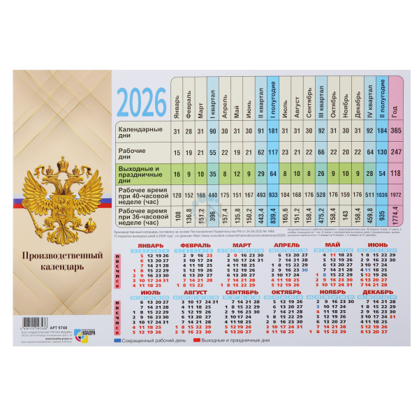 Календарь табель настол 2026г 210*297 Квадра Госсимволика 9748 мелов бум